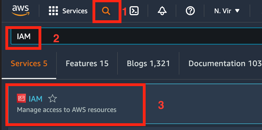 Select IAM (Manage access to AWS resources)