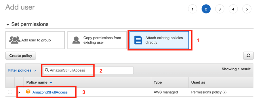 Then search for AmazonS3FullAccess in the filter policies search box.