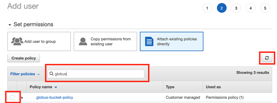Search for the policy name you created (e.g. “globus-BUCKETNAME-access”).