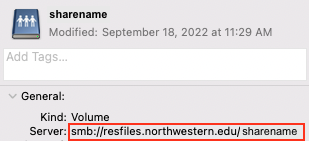 In the window that pops up, under the “General” section, copy the path in the Server field. It will start with smb:// followed by your access zone, then a path to the share separated by slashes. See screen shot below.