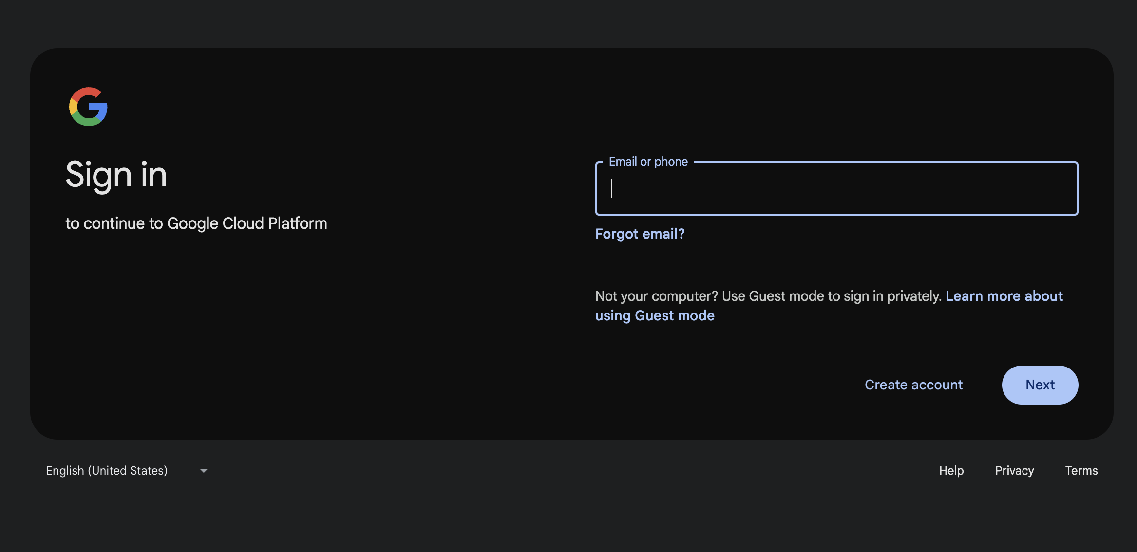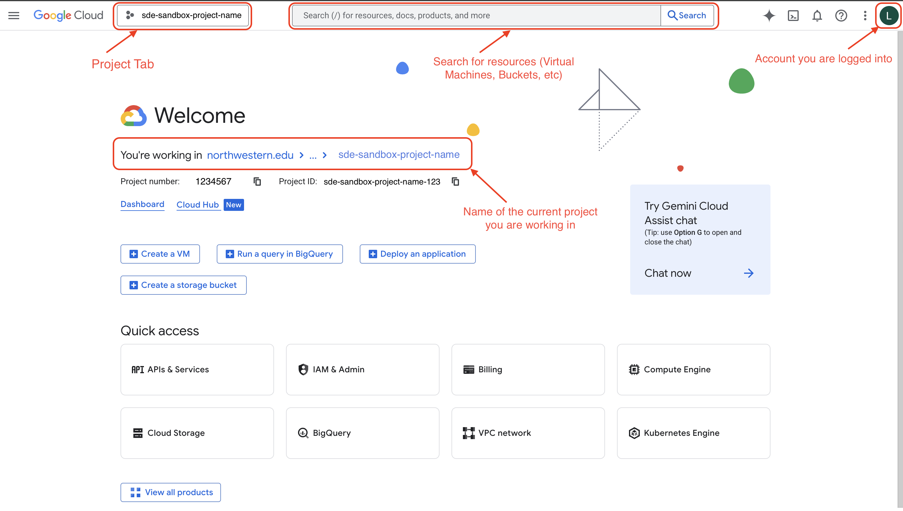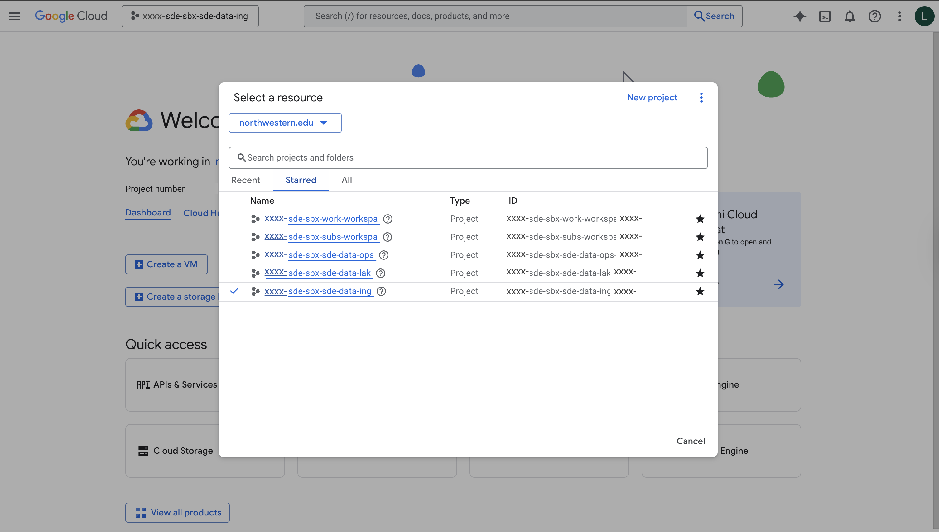 If you connect to Google Cloud without the Northwestern VPN active, you will see errors and/or SDE resources will not be visible.
