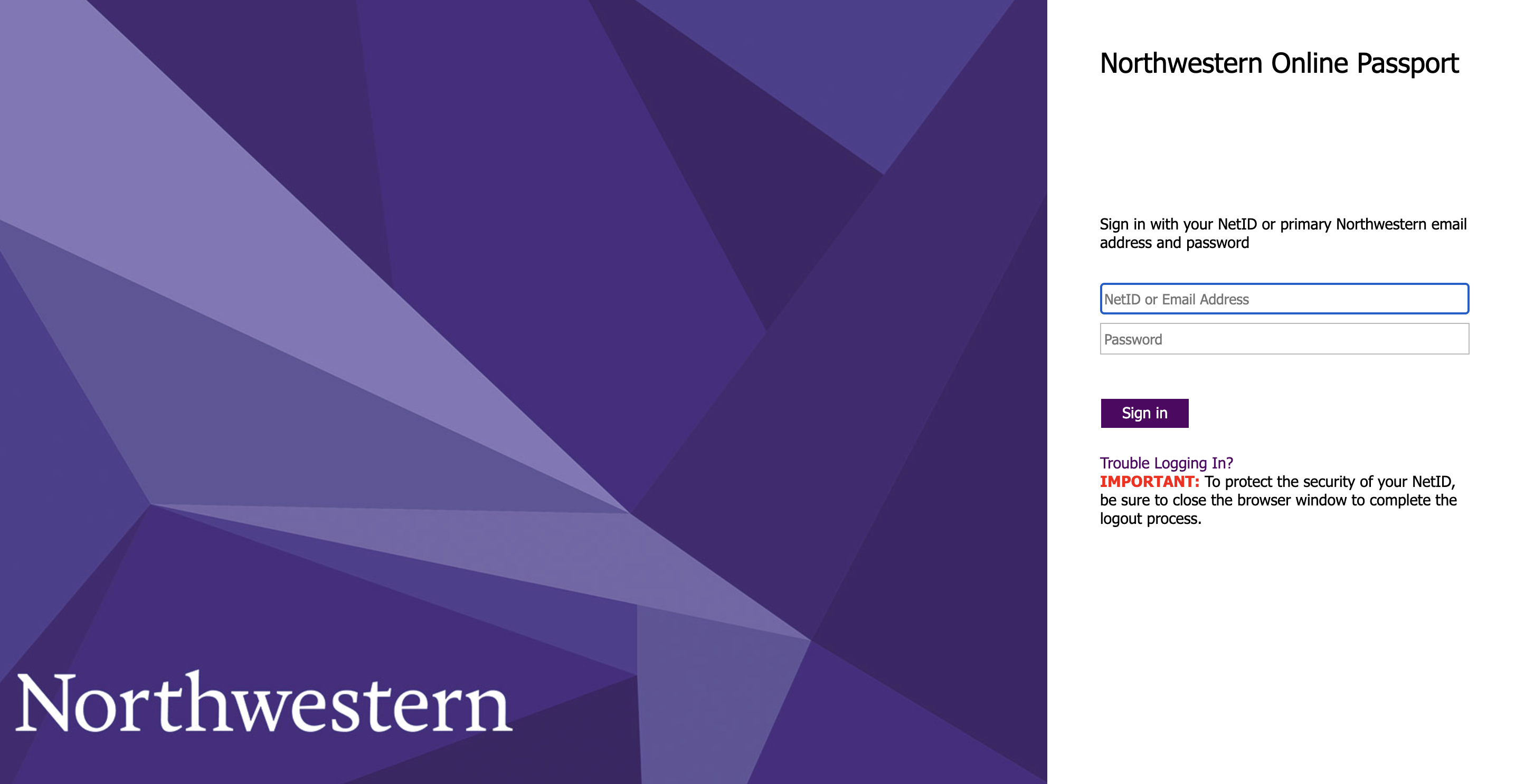 You redirected to the Northwestern Single Sign on page where you will enter your Northwestern email address and password
