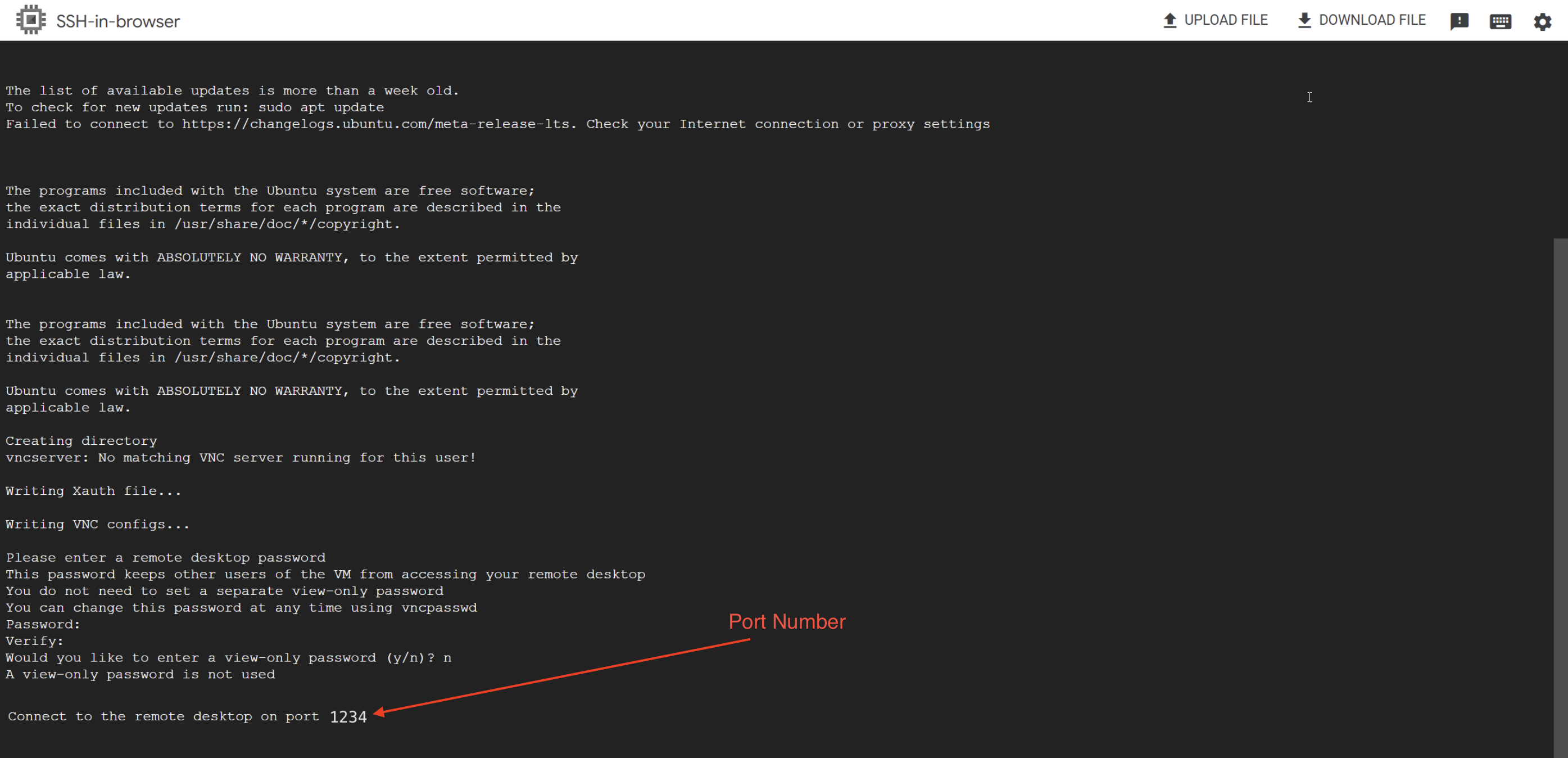 Find the remote desktop port number in the SSH-in-browser terminal. There will be a line similar to