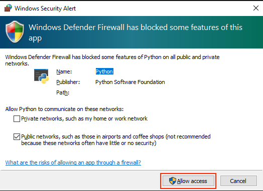 If you are using a computer running Windows, Windows Defender will open up a firewall window. gcloud is a Python application, so the message may reference Python. Click “Allow Access”. You will then be taken back to your terminal window.