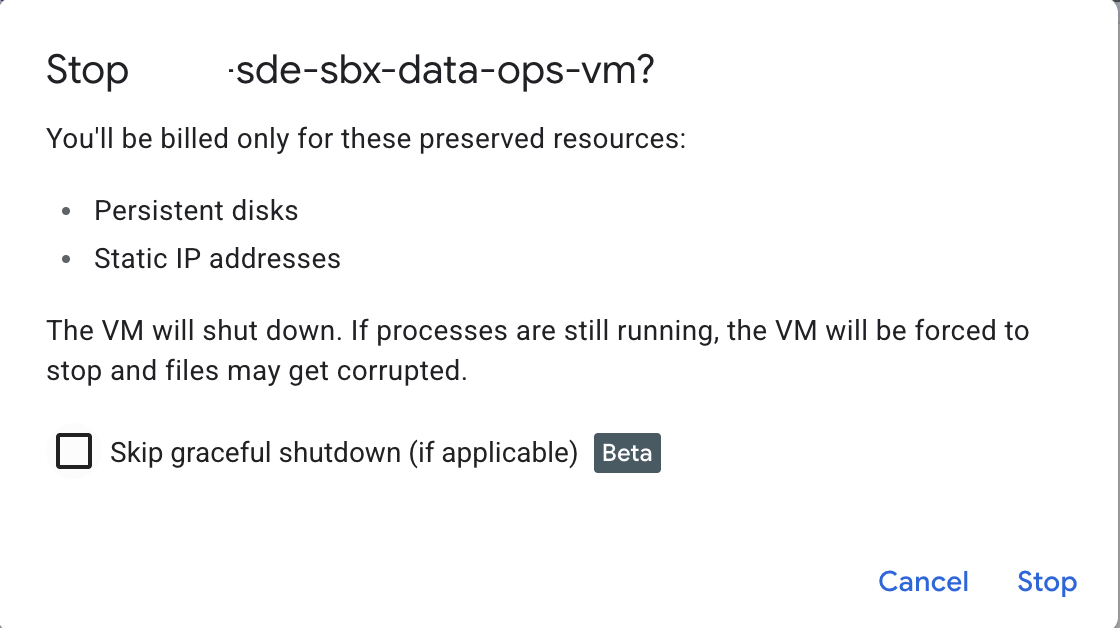 This does NOT delete your VM. All your data and configuration stay intact. You’re only stopping it to avoid extra costs.