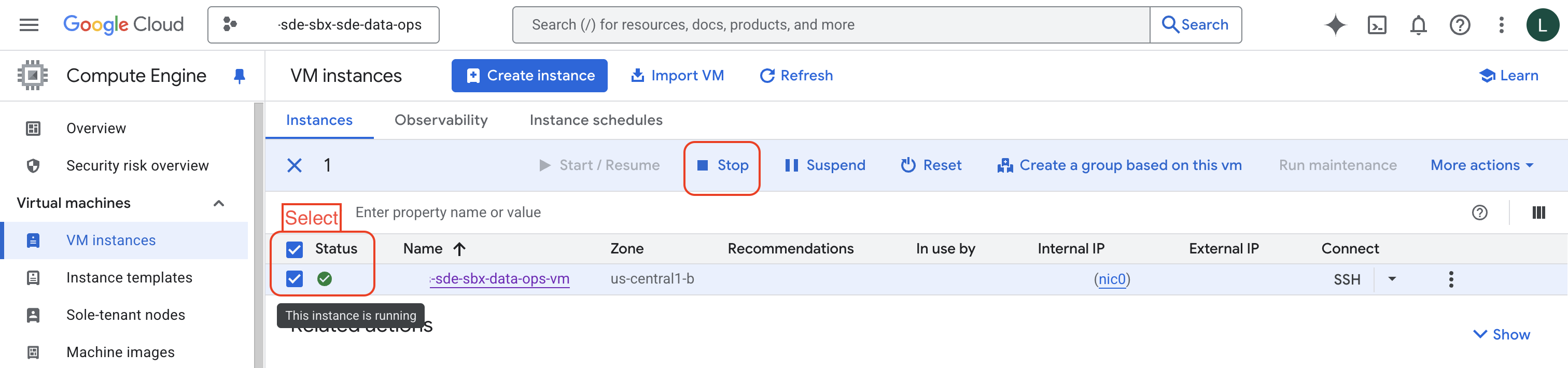 Navigate to the VM Instances page and find the VM you wish to shut down.