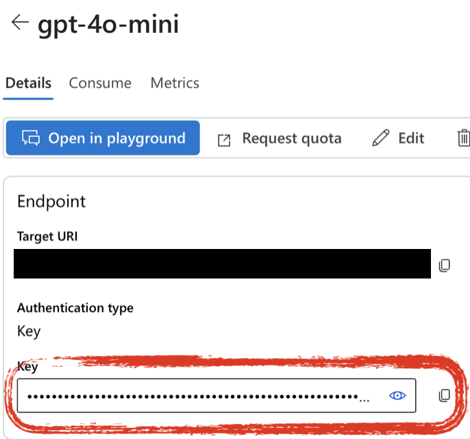 The endpoint is a URL that points to your model. Copy the “Target URI” listed in the “Endpoint” section of the model deployment details page. Delete everything after “.com/” and replace it with “openai/v1” so that your endpoint URL looks like:
