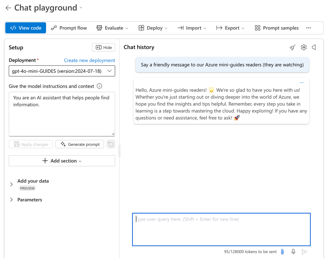 This section walks you through the steps for creating a basic chat model and working with it through the Microsoft Foundry.