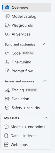 Once the project and related resources are created, you should be on the overview page for the new project within Microsoft Foundry. The project name should be listed at the top of the page, and you should see a menu similar to this on the left: