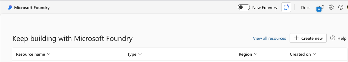 From the Foundry start page, click on “+ Create New.” You will be given a choice between a Microsoft Foundry resource and an AI hub resource. Choose the AI hub resource.