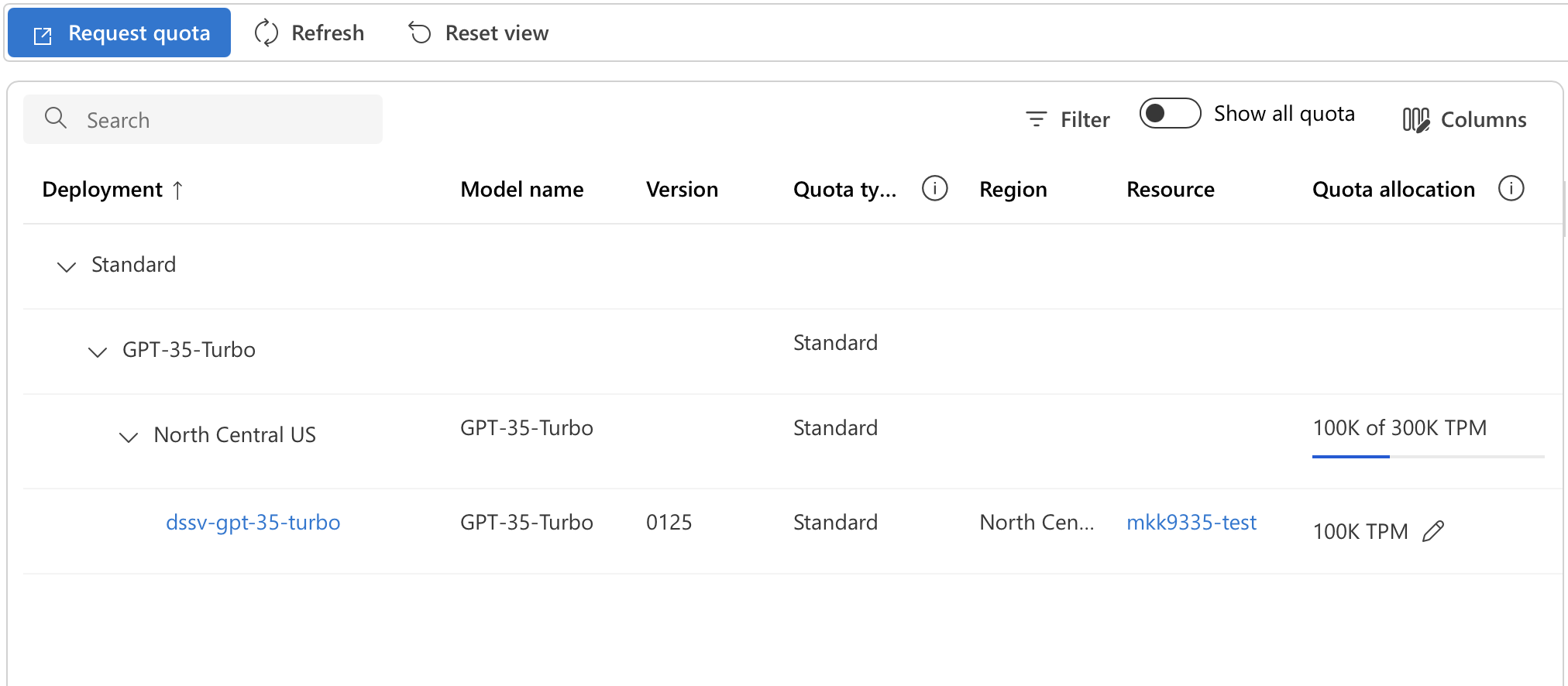 For example, the overall quota for GPT 3.5 Turbo models in the North Central US region might be 240K tokens per minute. If you deploy a single instance of that model through a single resource, all 240K tokens can be allocated to that deployment. But if you create another resource in the same region (North Central US) and deploy the same model (GPT 3.5 Turbo), you would need to lower the quota assignment on the first model deployment to allocate some of the limit to the second model deployment.