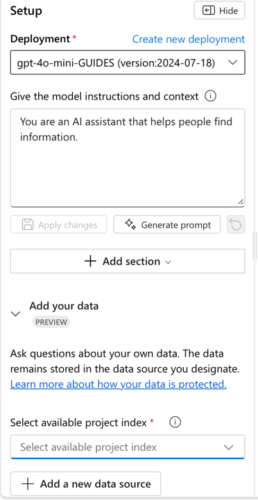 You can modify the model instructions and context from the Setup section. You can change the pre-written instructions. The “+ Add section” has options to add system safety messages or examples of how you want the model to respond. Safety messages allow you to control possibly harmful behavior from the model, for example, disclosing private instructions you have given it, or generating biased or inappropriate output.